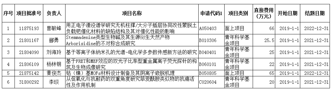 近日,2018年度国家自然科学基金项目评审结果揭晓, 免费色情影片共获批主持6项,其中面上项目2项、青年科学基金项目4项,到校总经费223.5万元,具体立项情况如下: