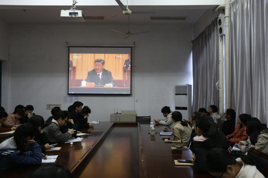 师生代表怀着无比激动的心情在志廉楼136会议室收看了大会现场盛况。