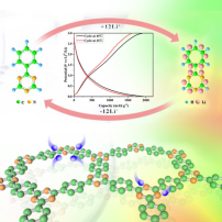 Organics with the merit of renewability have been viewed as the promisingalternative of inorganic electrode materials in lithium-ion batteries, but most of them displayinferior performance due to the sluggish ion/electron diffusion and the potential dissolution inaprotic electrolytes. Here, covalent triazine frameworks (CTFs-1), full of vertical pores andlayered spaces for Li+ transfer, have beensynthesized with p-dicyanobenzene as the monomerby a facile two-step method including a prepolymerization with CF3SO3H as the catalyst and deep polymerization in molten ZnCl2. CTFs-1-400, obtained at the deep polymerization temperature of 400 °C, exhibits the superlithiation property with the specific capacities of 1626 mA h g−1 at 25 °C and 1913 mA h g−1 at 45 °C at 100 mA g−1, indicating the formation of Li6C6/Li6C3N3 in the reduction process. Electrochemical analysis and density functional theory calculation indicate that the ultrahigh capacity is mainly contributed by the capacitance of micropores and the redox capacity of benzene and triazine rings. Moreover, CTFs-1-400 displays the specific capacity of 740 mA h g-1 for 1000 cycles at 1 A g−1 with almost nocapacity fading.