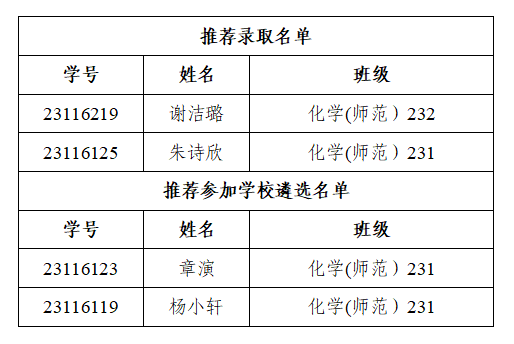 根据《免费色情影片 “祖楠班”实施管理办法》(绍免费色情影片 办发〔2023〕5号)、《化学化工免费色情影片 “祖楠班”选拔实施办法》,经学生自主申请,免费色情影片 综合评审,拟推荐录取谢洁璐等2位学生为第十四期卓越教师养成班“祖楠班”学员,拟推荐章演等2位学生参加学校统筹名额遴选。现予以公示,具体名单如下: